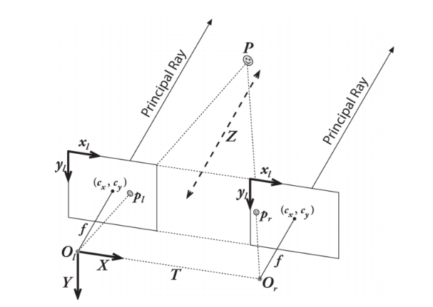 对于多目相机系统或者RGBD 相机除了要对别对每个相机进行以上标定以外,还需要求传感器之间的变换T,以使同一时刻获取的数据能够“对齐”,以双目为例,左右两个相机的坐标系如下图: