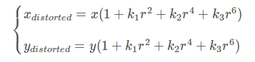 实际情况中我们常用r=0处的泰勒级数展开的前几项来近似描述径向畸变,矫正径向畸变前后的坐标关系为:
