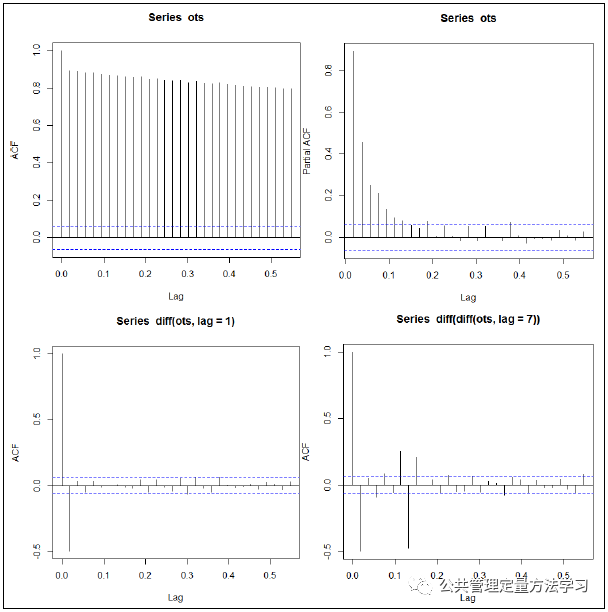 平稳性判断主要用到两个工具:自相关函数(auto correlation function, ACF)和偏自相关函数(patialauto correlation function, PACF);对于non-stationary的数据,ACF图不会趋向于0,或者趋向0的速度很慢;对于含有趋势的非平稳时间序列,通常可以通过引入ARIMA模型对其变换:ARIMA模型对于非平稳时间序列采用的方法是,运用差分运算提取趋势信息,最终把序列变为平稳序列。下面的四张图从左到右、自上而下分别对应原始数据的自相关函数、原始数据的偏自相关函数、原始数据一阶差分后的自相关函数、原始数据去除周期性后一阶差分的自相关函数: