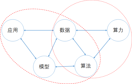 人工智能应用落地的五大决定性要素分别是应用、模型、数据、算法和算力,其中数据、算法和算力三大要素经常被提到,但在对于人工智能落地应用而言,应用和模型是必不可少的两个要素。五大要素间的关系如下图所示。