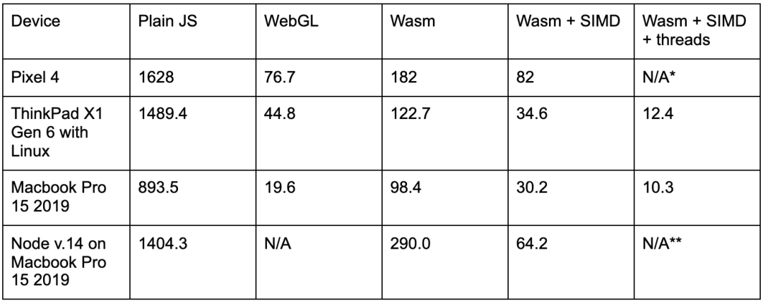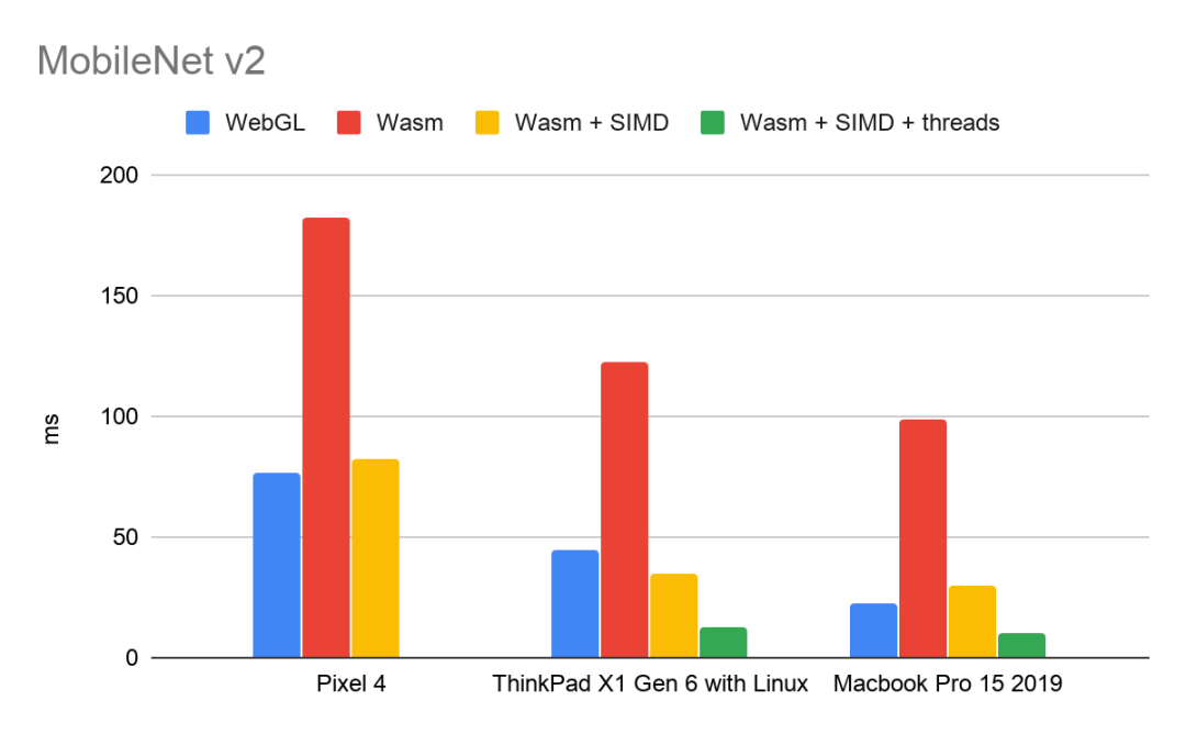*注:由于移动浏览器中的多线程支持仍在开发中,因此 Pixel 4 无法使用 TF.js 多线程 Wasm 后端基准。iOS 中的 SIMD 支持也仍处于开发阶段。