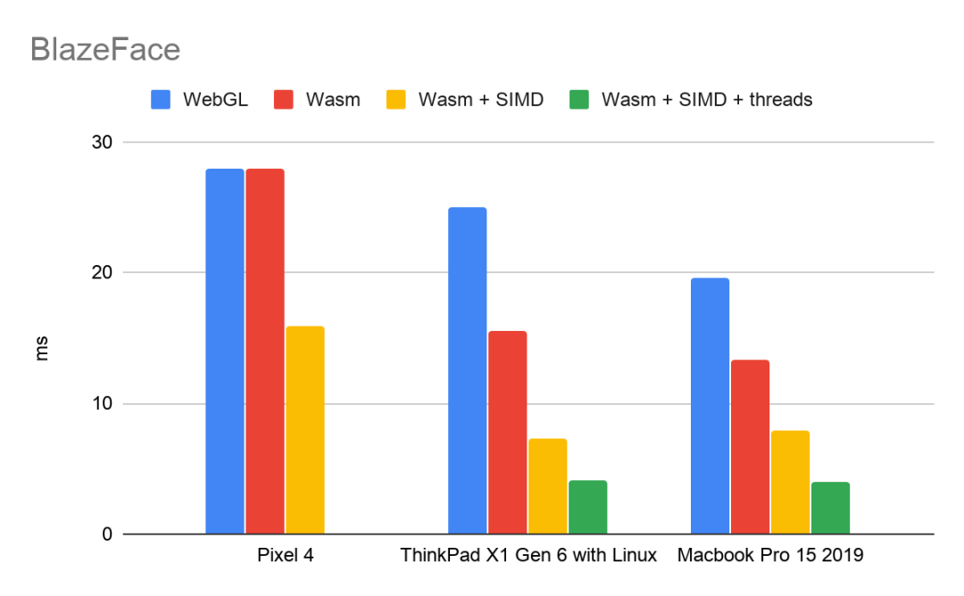 SIMD 和多线程为我们的 Wasm 后端带来重大性能提升。BlazeFace 是拥有 10 万个参数和大约 2000 万次乘加运算的轻型模型。以下是在 Google Chrome 浏览器中演示了 BlazeFace 的性能评测: