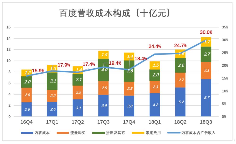 百度营收成本包括四大块:内容成本、流量购买、折旧及其它及带宽费用。其中最沉重的负担是内容成本,2017年累计支出134亿,2018年前个三季度支出161亿。其中Q3支出67亿,占广告收入的30%。