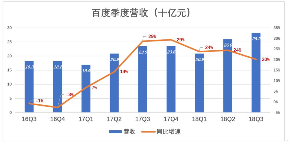 2018年Q3,百度营收282亿,同比增长20.1%。2016年百度季度营收一度出现负增长,2017年Q2开始,增速显著提升,如今天已持续6个季度。