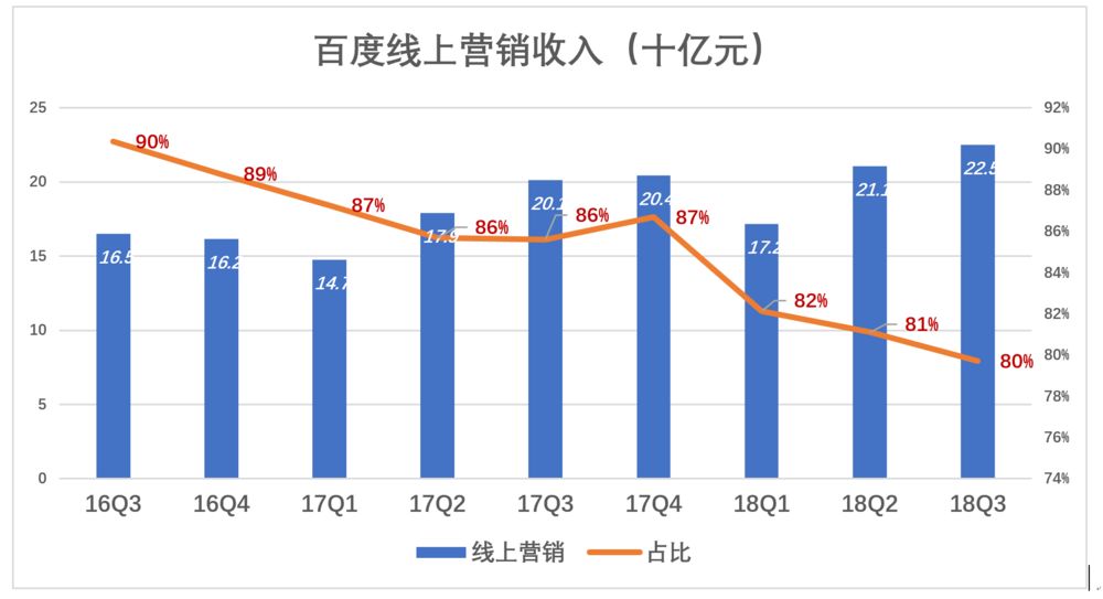 从营收结构看,百度正逐步改变收入来源单一的境况。2015年Q1,来自线上营销的收入占营收的98%,2016年Q3降至90%,2018年Q3进一步降至80%。