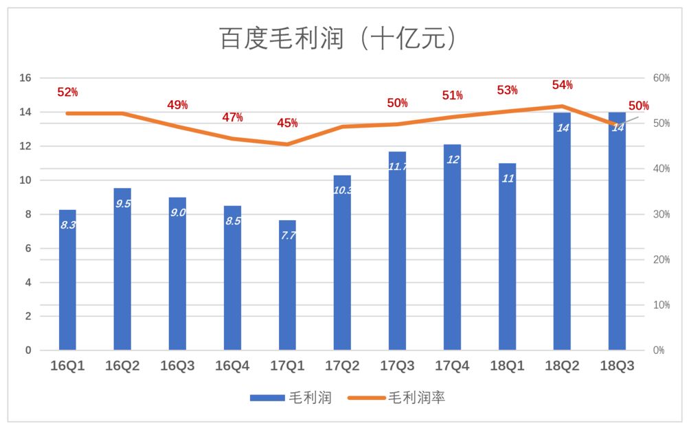 营收结构变迁对百度“赚钱能力”没有显著影响,毛利润率始终保持在较高的水平。2018年Q3毛利润141亿,毛利润率50%。