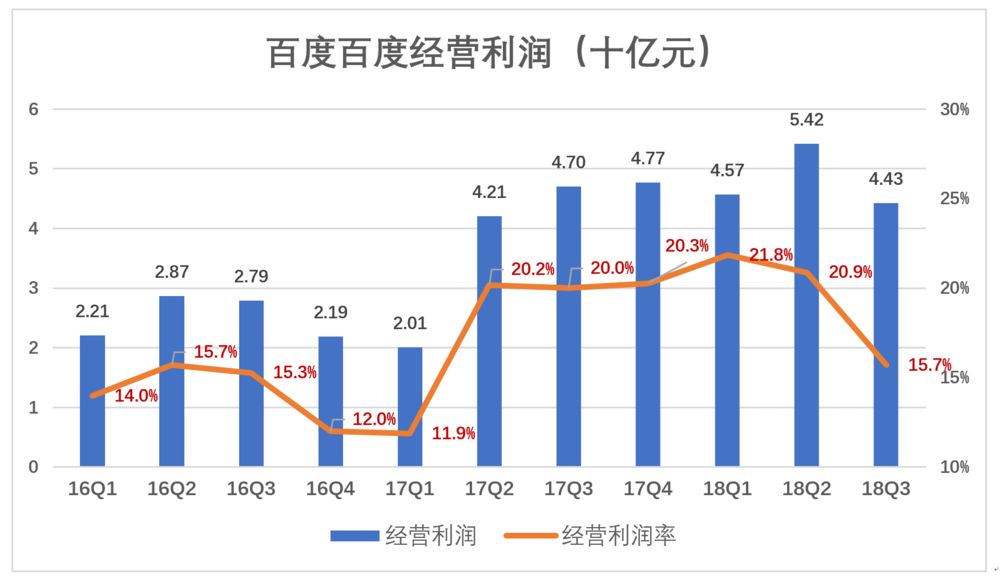 2018年Q3,百度经营利润率降到15.7%,从财报看是加大了内容及市场营销方面的投入。看来是要再次“换档”爬坡。