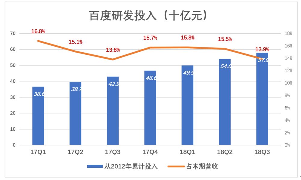 从2012年Q1到2018年Q3,百度研发投入累计达579亿,占同期总营收的14.5%。其中2018年Q3研发费用39.2亿,占营收的13.9%。