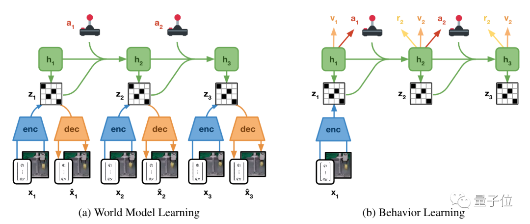 不难发现,其中World Model Learning部分的逻辑就是一个经验积累的过程,Behavior Learning部分则是一个动作输出的过程。