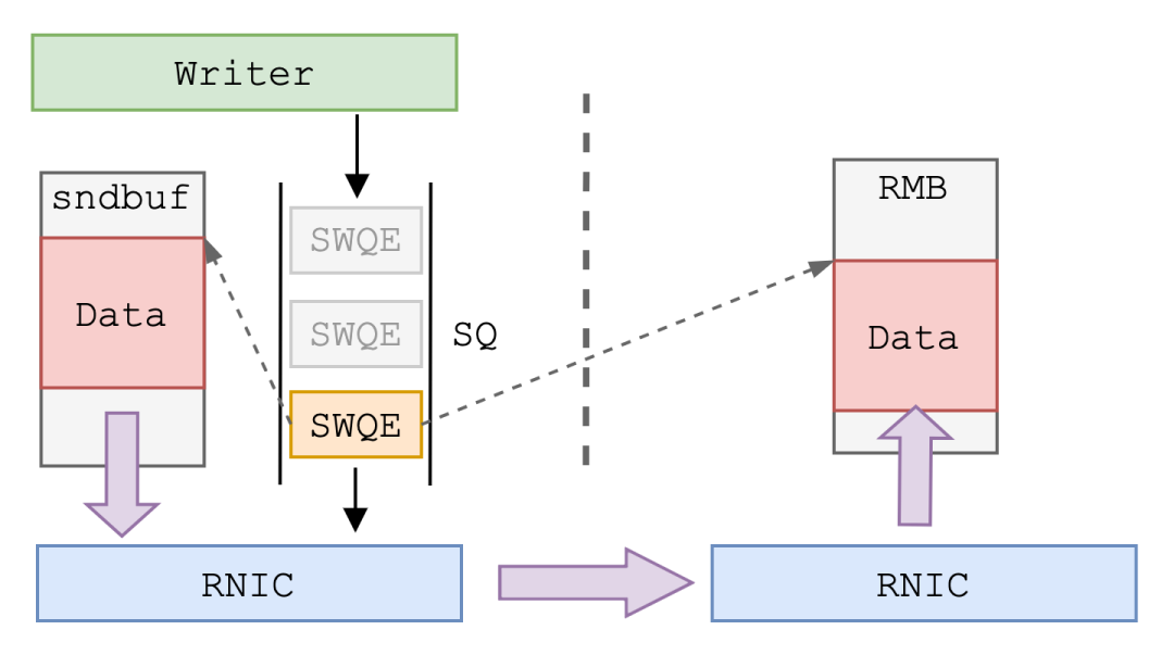 - 发送端 RDMA 使用者 (SMC-R 内核协议栈) 向本地 SQ 中 Post SWQE,SWQE 中记录了待发送数据长度和内存地址。发送端 RNIC 根据 SWQE 记录的信息取出相应长度的数据发送到对端;