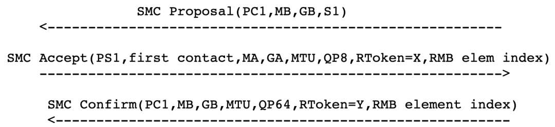 如前篇所述,使用 SMC-R 协议有两种方法。其一,是在应用程序中显式创建 AF_SMC 族的 socket;其二,是利用 LD_PRELOAD 或 ULP + eBPF 的方式透明的将应用程序中的 AF_INET 族 socket 替换为 AF_SMC 族 socket。我们默认使用 SMC-R 通信的节点已经加载了 SMC 内核模块,并通过上述方式将应用程序运行在 SMC-R 协议上。接下来,我们以 first contact  (通信两端建立首个连接) 场景为例,介绍 SMC-R 通信流程。