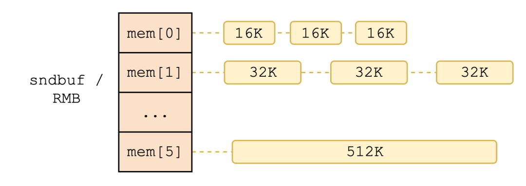 SMC-R 协议栈为每条 SMC-R 连接分配了独属的收发缓冲区:sndbuf (发送缓冲区) 与 RMB (接收缓冲区,Remote Memory Buffer)。这是两片地址连续,长度在 16 KB ~ 512 KB 间的内核态 ring buffer。