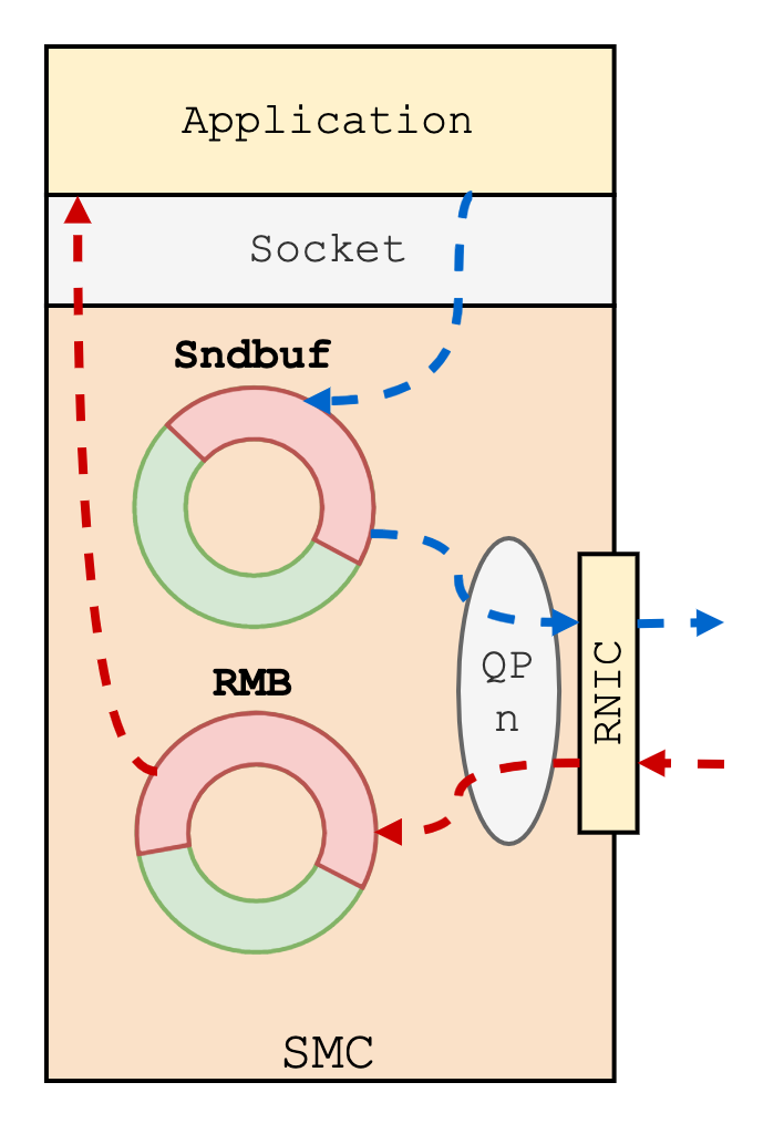 其中,sndbuf 用于存放连接待发送的数据,被注册为 DMA 内存。本地 RNIC 设备可以直接访问 sndbuf,从中取走有效负载 (payload)。而 RMB 用于存放远程节点 RNIC 写入的数据,即连接待接收的数据。由于需要被远程节点访问,因此 RMB 被注册为 RDMA 内存。