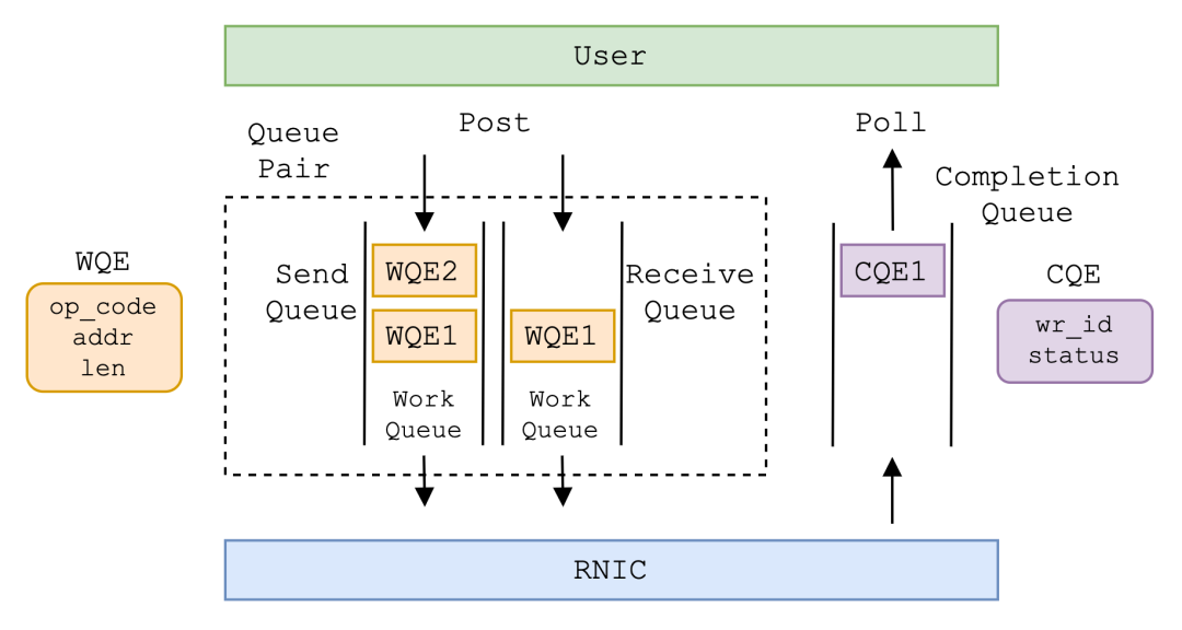 QP 本质是存放工作任务 (Work Request, WR) 的工作队列 (Work Queue, WQ)。负责发送任务的 WQ 称为 Send Queue (SQ),负责接收任务的 WQ 称为 Receive Queue (RQ),两者总是成对出现,称为 QP。用户将希望 RNIC 完成的任务打包为工作队列元素 (Work Queue Element, WQE),post 到 QP 中。RNIC 从 QP 中取出 WQE,完成 WQE 中定义的工作。