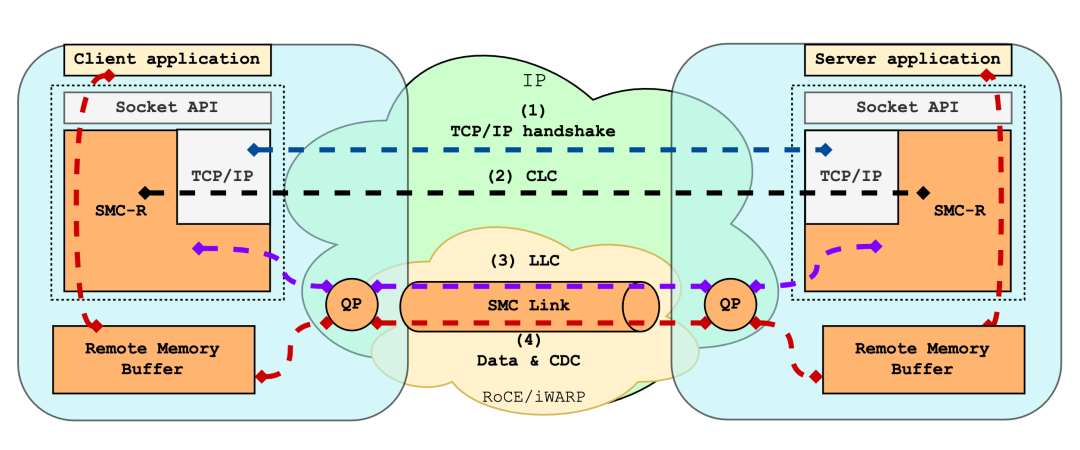 在系列文章的第一篇中我们提到,SMC-R 名称中的“共享内存”指的是接收端的 RMB。结合上述的 RDMA WRITE 操作与 CDC 消息,SMC-R 的共享内存通信流程可以总结为: