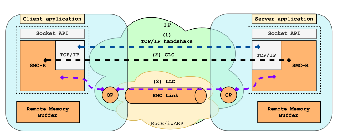 包括:通过 TCP 握手确认对端 SMC-R 能力;使用 TCP 连接传递 CLC 消息,交换 RDMA 资源、创建 RDMA 链路、建立 SMC-R 连接;通过 RDMA SEND 操作发送 LLC 消息验证 Link 可用;基于 Link 使用 RDMA WRITE 传输应用程序数据,并利用 CDC 消息同步 RMB 中数据变化;关闭 SMC-R、TCP 连接,销毁 RDMA 资源等一系列过程。