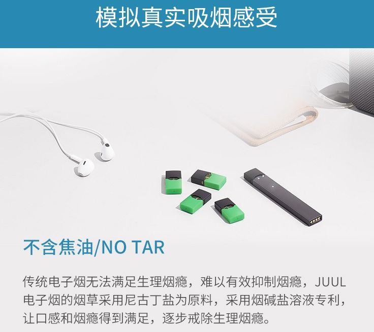 烟弹和烟杆分体设计,JUUL采用尼古丁盐为原料,采用盐碱盐溶液专利,让口感和烟瘾得到满足。