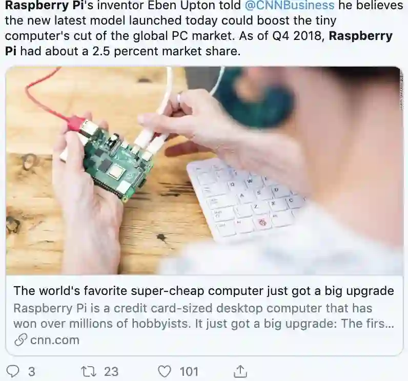 树莓派的创造者 Eben Upton 在接收采访时就直言不讳,最新的树莓派 4 将会刺激小型计算机在全球 PC 市场的份额。