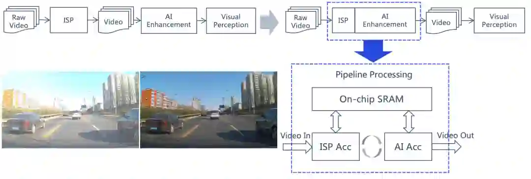 随着自动驾驶对车载成像质量的阶跃式提升需求,车载ISP,特别是针对驾驶场景优化的AI ISP处理算法和处理芯片,将迎来爆发式的发展。AI在车载ISP整个流程中将变得越来越重要,特别是在降噪、去模糊、HDR等问题上,可以在夜晚、阳光直射、进出隧道等暗光、强光、高动态场景得到远超人眼的成像效果,同时最大程度上解决由Sensor引起的噪点、模糊等问题。将AI计算前置在ISP计算Pipeline中,通过流式计算,使得ISP的计算Pipeline不被打断,也将大大提升AI ISP的性能功耗比。