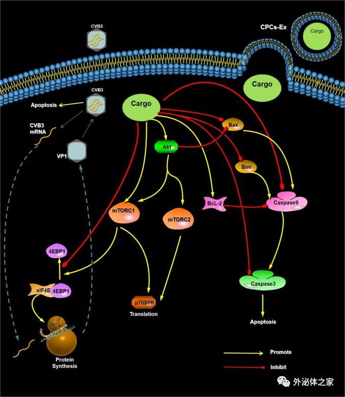 CPC衍生的外泌体(CPCs-Ex)工作示意图病毒性心肌炎(Viral myocarditis,VMC)是扩张型心肌病和心源性猝死的常见原因。寻找有效的VMC疗法仍然是一个巨大的挑战,而关于心脏祖细胞(cardiac progenitor cells,CPC)的研究可能为VMC的治疗提供一个转折点。CPC是一组分布在整个心脏的异质细胞,能够分化为特定的几种细胞类型,包括心肌细胞(CMs)、血管平滑肌细胞和内皮细胞(ECs),为心脏再生和功能重建提供了广阔的前景。到目前为止,干细胞治疗在心脏修复方面取得了令人鼓舞的结果。此外,与来自骨髓或脂肪组织的干细胞相比,来自成年心脏的CPCs已成为心脏细胞治疗的最好的候选者。然而,CPC直接在体内转分化为心脏组织被认为是不可能实现的。研究表明,成人干细胞治疗的机制是通过旁分泌释放含有生长因子和细胞因子的细胞外囊泡来发挥抗凋亡、抑制免疫和促进血管生成的作用,外泌体是源自CPCs的细胞外囊泡的主要活性成分。外泌体是在生理和病理条件下从树突状细胞(DC)、巨噬细胞、T细胞和其他组织起源的细胞通过胞吐作用分泌的纳米级(30–100 nm)颗粒,携带有蛋白质、脂质和调节性核酸,例如外泌体可以将小分子RNA和大的非编码RNA传递到受体细胞中。一些临床前研究表明,与细胞移植相比,CPC衍生的外泌体(CPCs-Ex)对心脏修复具有更好的治疗作用。实际上,包含特定药物或试剂的CPCs-Ex已被有效地用于治疗心血管疾病。在急性心肌缺血再灌注小鼠模型中,Sca1 + CPCs-Ex可以通过抑制caspase-3 / 7来减少细胞凋亡。富含miR-21的CPCs-Ex通过靶向PDCD412来预防心肌细胞凋亡。一项对新生儿CPCs-Ex进行了深入的蛋白质组学分析发现外泌体中存在着高水平的胰岛素样生长因子-1(可促进心脏保护、抑制细胞凋亡),提示CPCs-Ex具有抗凋亡作用。柯萨奇病毒B(CVB)是微小RNA病毒家族的成员,是一种常见的肠病毒,可引起各种人类全身性炎症性疾病,例如心肌炎、脑膜炎和胰腺炎,而六种CVB血清型分别会造成不同的疾病和症状,其中婴儿和儿童更容易受到CVB的侵害。CVB诱导的VMC目前缺乏有效的治疗方法。几种临床前干细胞疗法在减少炎症和改善心肌功能方面取得了一些进展,但仍不能令人满意。作为一种无细胞的治疗方法,外泌体可以避免许多细胞治疗的局限性。CPCs-Ex可以预防星形孢菌素诱导的心肌细胞凋亡,并且比MSCs分泌的外泌体具有更好的心脏保护作用。但是,CPCs-Ex在VMC中的作用仍未被研究。在这项研究中,研究人员旨在探索CPC衍生的外泌体(CPCs-Ex)是否可以通过mTOR信号途径减少病毒性心肌炎(VMC)的细胞凋亡。在体外实验里,CVB3病毒感染H9C2细胞后添加外泌体,以检测CPCs-Ex的抗凋亡作用。与对照组相比,外泌体处理后的细胞凋亡率降低,同时病毒衣壳蛋白1(VP1)的表达下降,Bim /caspase家族的促凋亡因子表达降低。同时,CPCs-Ex促进了Akt、mTOR和p70S6K的磷酸化,抑制了4EBP1的磷酸化。在体内实验里,感染CVB3的心肌细胞的凋亡情况、CVB3和促凋亡因子的表达以及Akt / mTOR因子的磷酸化结果与体外实验结果一致。研究人员用雷帕霉素和MK-2206抑制Akt / mTOR信号通路,同时将大鼠4EBP1、p70S6K、Akt1和Akt2转染H9C2细胞里建立了稳定转染的细胞系。在雷帕霉素或MK-2206处理组中,CPCs-Ex降低了H9C2细胞的凋亡和CVB3 mRNA的表达。在Akt2、p70S6K和4EBP1过表达组中,CPCs-Ex促进CVB3诱导的细胞凋亡、促进了VP1表达和caspase-3的裂解。因此, CPCs-Ex通过抑制CVB3的病毒增殖并调节mTOR信号通路以及Bcl-2和caspase家族的表达,在CVB3感染的细胞中发挥抗凋亡作用。病毒性心肌炎主要由CVB3感染引起,目前尚缺乏特定的治疗方法,该研究确定了CPCs-Ex在CVB3感染的细胞和大鼠中的抗凋亡作用,表明CPCs-Ex可能是治疗病毒性心肌炎的有效工具。研究人员相信,随着对CPCs-Ex功能的更深入研究,在治疗病毒性心肌炎方面将取得更多突破。参考文献:Li X, Yang Z, Nie W, Jiang J, Li S, Li Z, Tian L, MaX. Exosomes derived from cardiac progenitor cells attenuate CVB3-induced apoptosis via abrogating the proliferation of CVB3 and modulating the mTOR signaling pathways. Cell Death Dis. 2019 Sep 18;10(10):691. 【科研成长加油站】四天学会Nature级的图表及插图制作方法(2019/9/26-29 广州)单细胞测序数据挖掘与课题设计学习班(10/12-13 上海)DNA甲基化与表观遗传学数据挖掘与分析学习会(10/26-27 上海)中药复方发表SCI如何突破5分大关(10/19-20 北京) 万用模版SCI英文论文写作法学习会 (11/22-24 上海) TCGA、GEO及SEER公共数据库挖掘与应用学习会 (10/26-27 上海) 系统评价与meta分析(11/7-10 上海);临床科研设计与数据管理(11/12-14 上海)生物医学数据挖掘培训班 | 10月19-20 北京 【官宣】外泌体之家| 外泌体学习班即将开班
