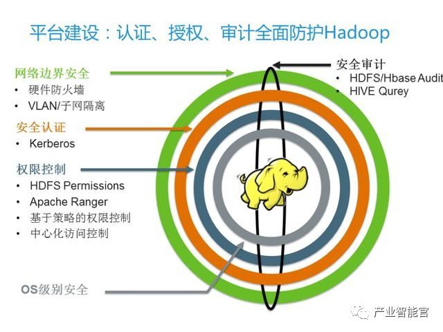 全面防护Hadoop。我们最早部署Hadoop集群时并没有考虑安全问题,随着集群的不断扩大, 各部门对集群的使用需求增加,集群安全问题就显得颇为重要。通过上图来看从里到外的安全防护体系主要包括哪些方面。