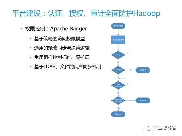 权限控制我们用的是Hadoop系统当中的安全管理框架Apache Ranger来实现,它是一种定义和管理安全策略的集中式组件,里面内置了一些通用的策略防护和策略模型,这些安全策略在Hadoop支持的组件上会被强制执行。