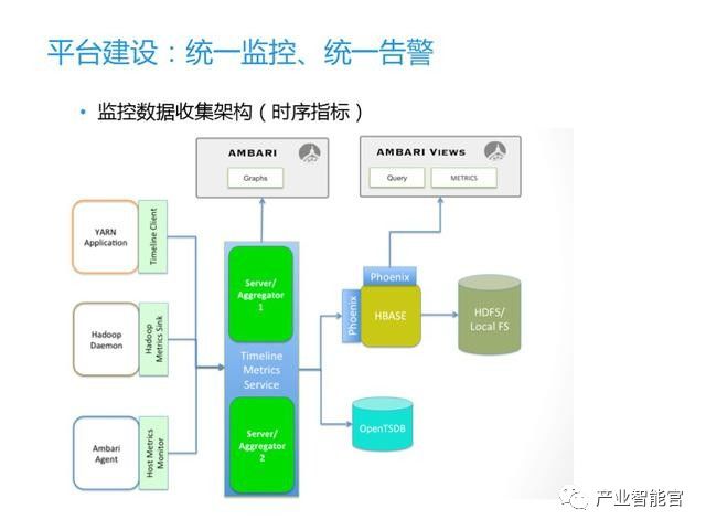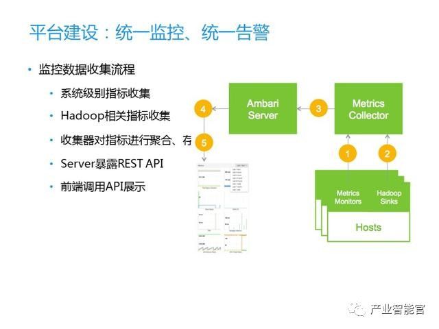 前面提到传统大数据监控是比较分散的。我们的方案是用AMBARI指标监控系统,它可以统一监控平台各类服务及主机的运行情况,提供各类服务及主机的相关指标,从而达到判断集群健康情况的目的。整个流程包括监控指标的采集、存储、聚合及指标获取。