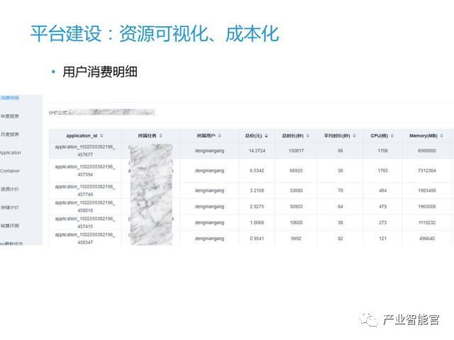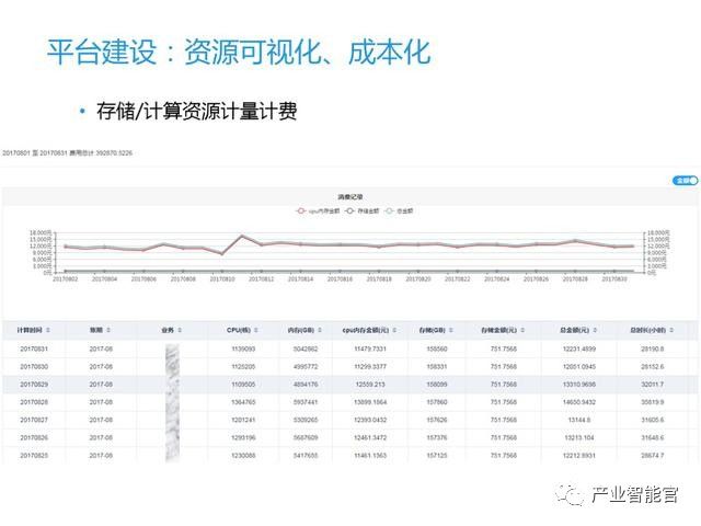 在这个平台上我们直观给出每个业务系的CPU、内存、存储的占用情况、使用的时长,以及转换的成本,同时也可以通过消费曲线观察异常消费,进行成本优化。