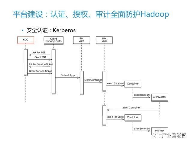 Hadoop本身并不串接用户账号,它主要是通过Kerberos协议对用户的身份进行验证。我们从 YARN 上的 MR 任务提交过程简单说明一下。