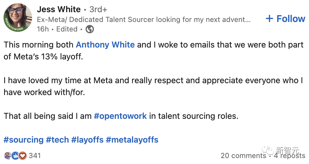 「今天早上,我和Anthony White都收到了裁员的电子邮件。我很喜欢我在Meta度过的时光,并且非常尊重和感谢与我共事过的每一个人。」她在 LinkedIn 上写道。