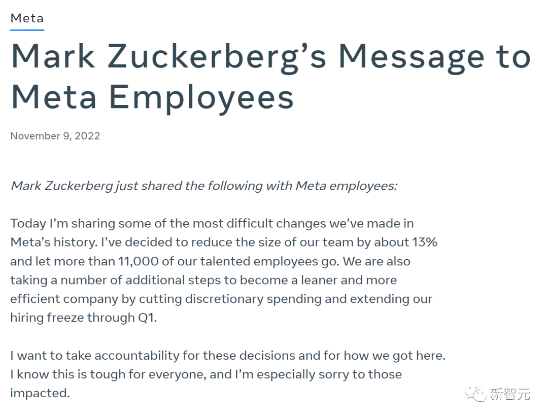 今天,我将分享我们在Meta历史上所做的一些最困难的改变。我已经决定,将我们的团队规模缩小约13%,让11000多名优秀员工离开。我们还采取了一些额外的措施,通过削减可自由支配的开支,并将招聘冻结期延长到第一季度,以成为一个更精简、更高效的公司。