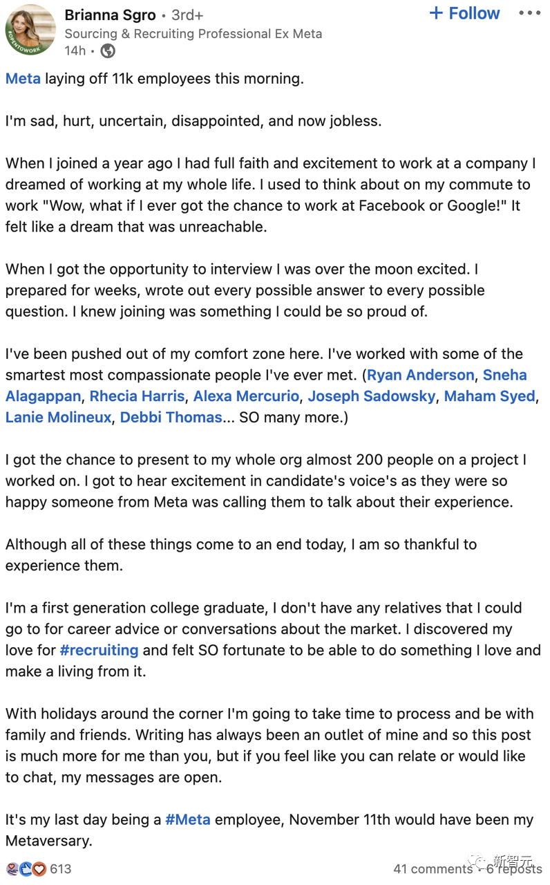 一位前Meta的招聘人员Sgro在LinkedIn上写道:「我失业了,我很难过,很受伤,很失望。」