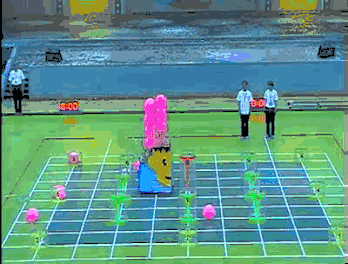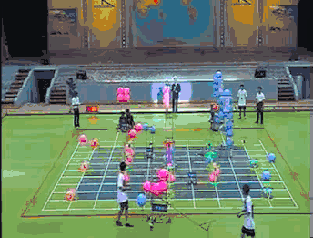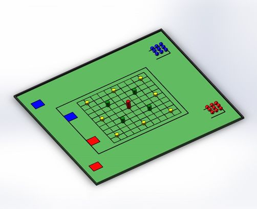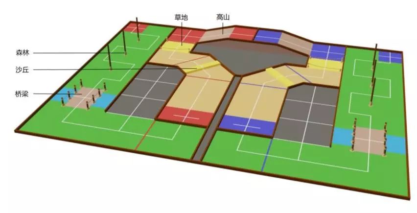比赛的场地为了模拟珠穆朗玛峰放置着17根高低不同的圆管,中间最高的圆管代表山顶,稍矮的为山腰,四周就是山脚。红蓝两队需要分别将赛球投掷进这些圆管内,最终由比分来决定胜负。此外,如果哪一队成功占领了包括中心在内的对角线上的五根圆管,那么该队便因为登顶成功而立即获胜。