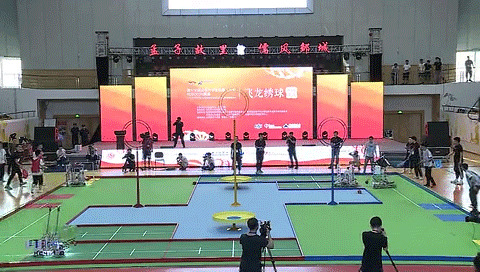 这一届的主题叫做“飞龙绣球”,要求参赛队携带自己制作的绣球来到赛场,每支参赛队伍可以制作两台机器人,由一台机器人到放球区拿起绣球,交给另一台机器人投掷。机器人需在彩球区的两个定点分别投掷两次,成功穿过圆环后,来到金球区,再次进行投掷,若金色绣球穿过圆环后顺利落入圆盘中,则称为“飞龙”,取得胜利。