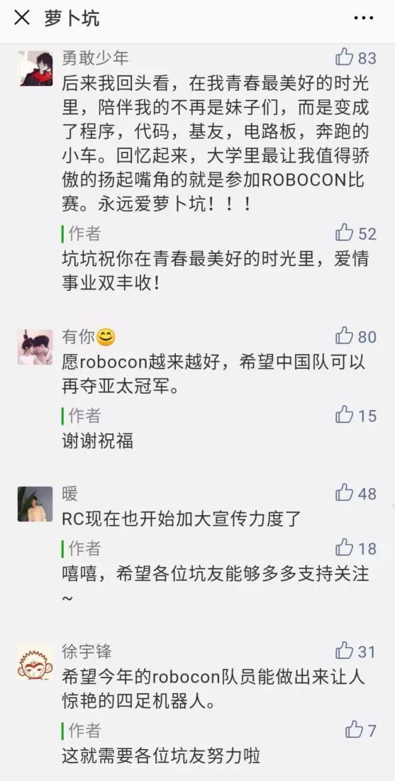 就像坑友们所说的那样,曾经为了梦想拼尽全力,是少年时期最为珍贵的回忆。一路走来,萝卜坑中留下了许多坑友们的欢笑和泪水,新旧面孔不断更迭,对比赛饱满的热情和对机器人永恒的热爱却从未改变。