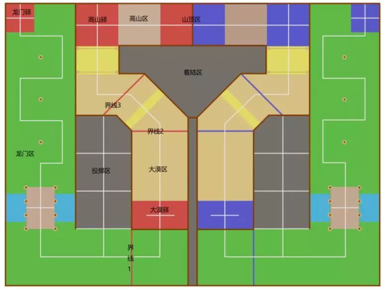 按照传统,比赛仍旧分为红蓝两方,各占一半场地。双方各持一个手动机器人“机器信使1”(MR1)和一台自动机器人“机器信使2”(MR2)。手动机器人携带作为信物的令牌从“龙门驿”(手动机器人的启动区)出发,沿森林、桥梁行进,跨过界线1,到达“大漠驿”(自动机器人的启动区),将令牌交给在大漠驿的MR2。一旦MR2成功地接收到令牌,它就可以沿着大漠区行进。MR2必须像马一样有四条腿,不能用轮子移动。MR2通过沙丘和草地,向“高山驿”进发,到达后,MR1可以进入投掷区投掷兽骨得分。如果MR1获得50或更多得分,MR2就可以登山,到达山顶区后,举起令牌,则该队获胜,这就是所谓的“登顶”。