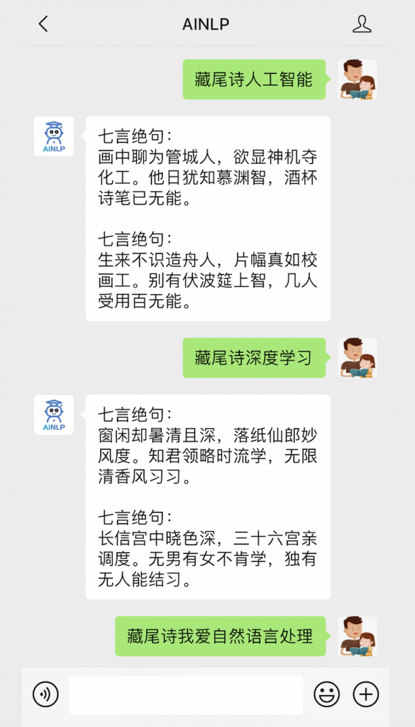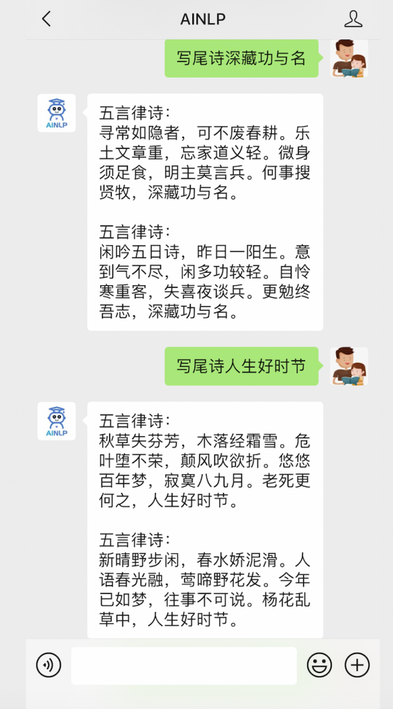 除了藏尾诗生成器,我还衍生了一个“写尾诗”的功能,就是输入几个字,这几个字一定要出现在古诗的尾部,关注AINLP公众号,回复“写尾诗输入内容”触发: