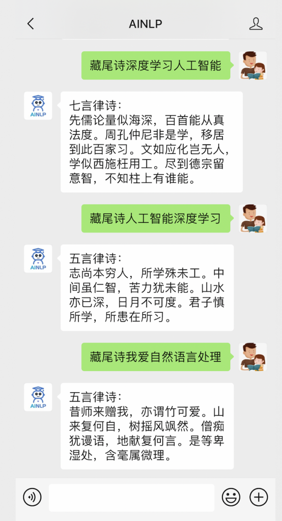 自从AINLP公众号后台对话上线自动写诗功能,特别是藏头诗生成器的功能后,发现有不少同学在使用,特别是过程中发现有的同学不仅需要藏头诗,还需要藏尾诗,这也让我第一次了解了藏尾诗。不过如果让用户随意输入尾词,诗句尾部的押韵基本上破坏了,但是作为大众娱乐需求,这功能还是可以有的。所能想到的第一个方法是:基于目前的模型强制在结尾处替换关键字,然后逐句生成,但是这种方法合成的藏尾诗必定会很生硬;第二个方法直接训练一个反向模型:基于GPT2-Chinese,用之前的古诗训练语料逆序训练了一个古诗反向生成模型,然后对于用户的输入,同样也反向处理,最后再正向呈现给用户,这种方法生成的藏尾诗应该会平滑很多。所以说干就干,基于第二种方法训练了一个藏尾诗生成器模型,感兴趣的同学可以关注AINLP公众号,直接回复“藏尾诗输入内容”触发“藏尾诗生成器”,例如: