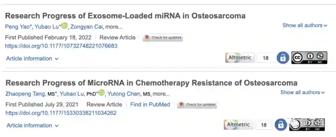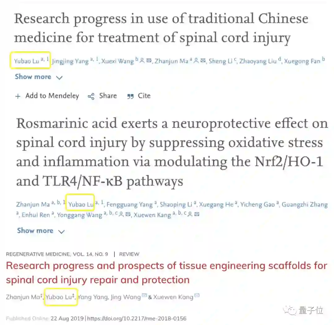 以脊髓损伤相关研究为例,其中两篇关于研究进展,两篇是共同一作的身份。