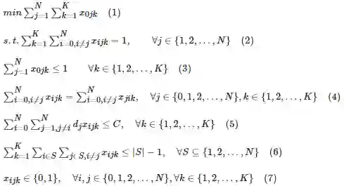 以i,j表示配送网络中的节点(i,j∈{0,1,2,…,N}), 其中0表示仓库点,其它表示客户点),以k表示车辆(k∈{1,2,…,K}),以为决策变量,表示车辆k是否从i点行驶到j点。则标准的车辆路径规划问题可以使用以下数据规划的形式描述: