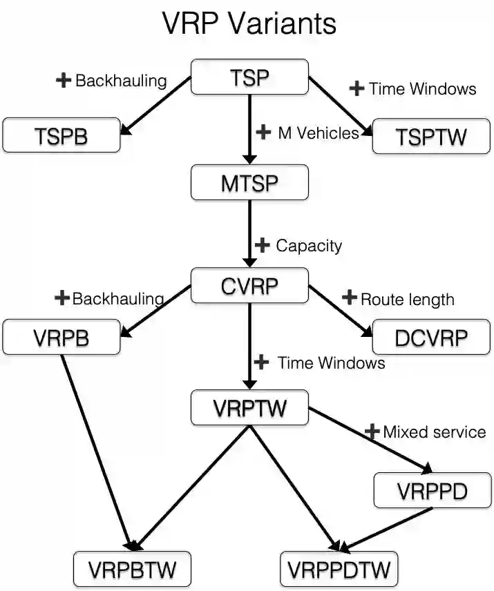 VRPPD:VRP with Pickup and Delivery, 车辆在配送过程中可以一边揽收一边配送,在外卖O2O场景中比较常见。