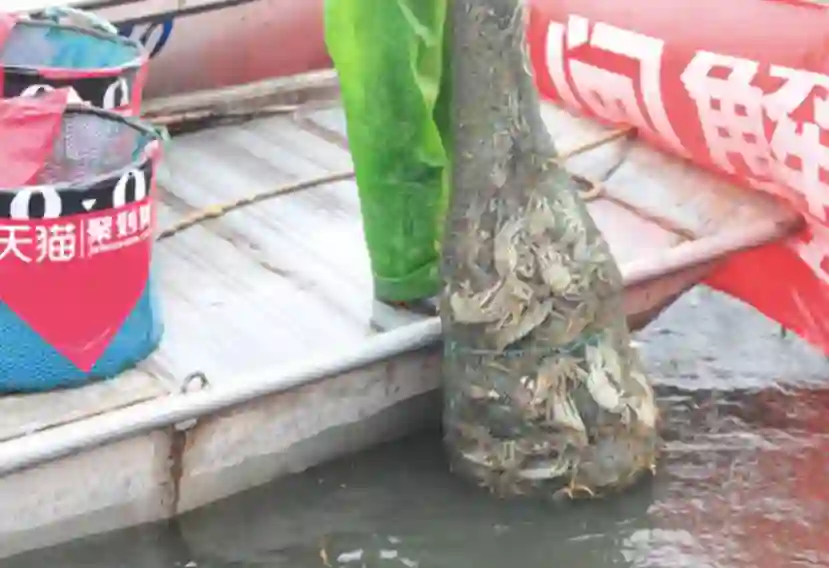 一艘小船上,谢霆锋与天猫生鲜资深总监朱霞面对镜头,手里各拿一只刚刚出水的大闸蟹。他们身旁还放着两篓大闸蟹,天猫抢得了2017年阳澄湖开湖第一捕。