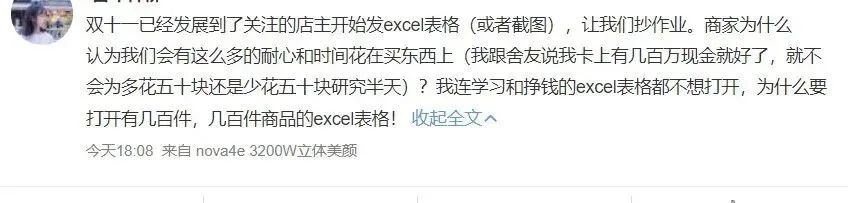 “双十一已经发展到了关注的店主开始发excel表格,让我们抄作业。商家为什么认为我们会有这么多的耐心和时间花在买东西上?我连学习和挣钱的excel表格都不想打开,为什么要打开有几百件商品的Excel表格!”
