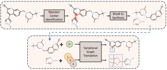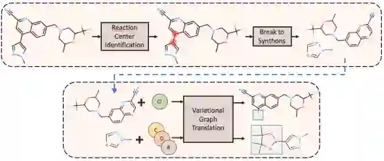 新药发现(Drug Discovery)领域中的一个基础问题是预测目标分子的合成路线,即逆合成预测(Retrosynthesis Prediction)。现有的方法大多将给定的目标分子(产物)与许多化学反应模版匹配,从而预测可能的反应物。然而,模版匹配耗费大量的算力,并且这些方法在新数据集上的泛化能力也欠佳。本文提出了一种名为G2Gs的不依赖化学反应模版的方法。G2Gs通过一系列图变换,将产物分子转换(或称为翻译)到反应物分子。G2Gs首先通过一个反应中心预测模块,将产物分子分解为多个合成子。然后它通过一个变分图翻译模块,将每个合成子转换到最终的反应物分子。实验结果表明,本文提出的方法的性能远优于那些不依赖反应模版的方法。并且,G2Gs的性能与基于模版的方法相近,但它不依赖任何领域知识,也有更好的可扩展性。