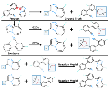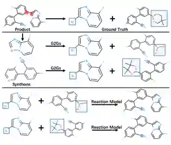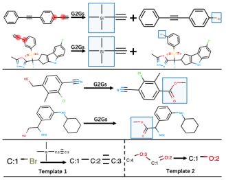 为了让读者对G2Gs有更直观的理解,本文给出了几组预测的可视化。图5展示了G2Gs预测准确的几个样例。这些反应所蕴含的反应模版如图5底部所示。图6展示了模型预测错误的一个案例。然而,这并不意味着本文的模型在这个案例上没能成功地预测一个可行的合成路线。这是因为一个分子往往可以通过多种方式合成,而数据集中的标签并不一定是唯一的方案。为了验证这个猜想,本文使用了一个前向反应预测模型。这个模型把G2Gs的预测结果(反应物)当作输入,并预测该反应的产物。如图6底部所示,该模型预测的结果正是逆合成任务的输入,这表明,G2Gs提供的合成路线的确可能是正确的。