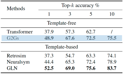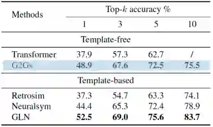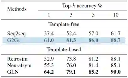 为了验证G2Gs的性能,本文在标准数据集USPTO-50K上进行了实验,它包含5万个原子对应的化学反应。本文采用top-k字符串精确匹配作为评估指标,即将预测的反应物的字符串表示与Ground Truth的字符串表示进行比较。本文在反应类型已知和反应类型未知两种情形下比较了各模型的性能,实验结果如下表所示。