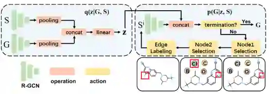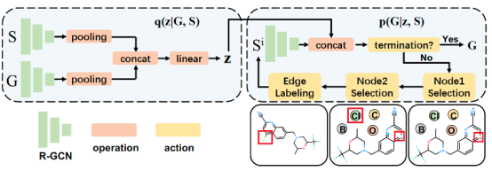 G2Gs的第二个模块是变分图翻译模块,其目的是将每个合成子翻译到最终的反应物。G2Gs将该过程看作是马尔可夫决策过程,它将当前子图视为当前的状态,并依次决定要采取何种动作,例如添加一个原子或一条边。值得一提的是,两个同样的合成子可能会被翻译成不同的反应物,为了鼓励模型生成多样的预测,本文在该模块中加入了一个隐变量来刻画这种不确定性。具体地说,该模块的每个决策包含四个动作:选取第一个点,选取第二个点,选取两个点之间边的类型,判断翻译过程是否中止。该模块框架图如下: