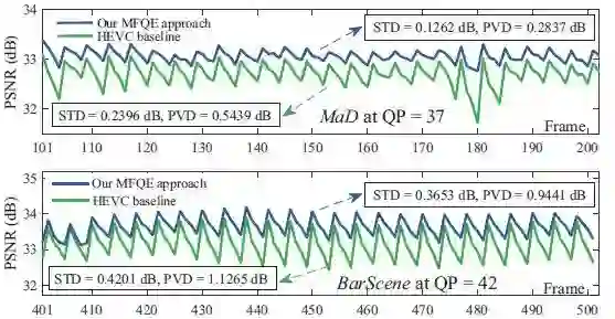 从图 1 中可以看出,本文提出的MFQE方法的效果(图 1 最下排中间)明显好于2017年的最新视频质量增强方法DS-CNN(图 1 最下排左边)。此外,还可以看出,经过MFQE算法进行质量增强后,压缩视频的帧间质量波动也明显减小,这也有利于提升主观感受。