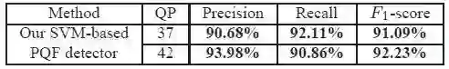 由于有损压缩后的视频观看时无法获取原视频,无法在质量增强前获得每帧的PSNR值。因此,首先需要研究一种无参考的PQF检测算法。考虑到PQF是相对于相邻帧质量较好的帧这一定义,本文将当前帧和相邻四帧(共 5 帧)均使用 [Mittal et al. 2012. No-reference image quality assessment in the spatial domain.] 中提出的无参考质量评估方法提取出特征,并将 5 帧所有特征放入 SVM 分类器训练,最终预测出当前帧是否是 PQF。该方法预测PQF准确度很高,在HEVC压缩视频中的准确率如表 2 所示。