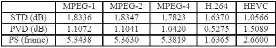 表1 不同压缩标准视频的平均质量标准差、峰谷差和峰间距。